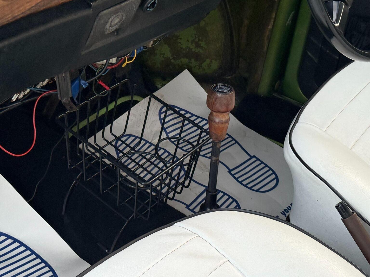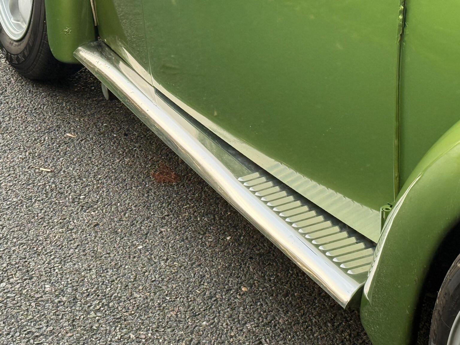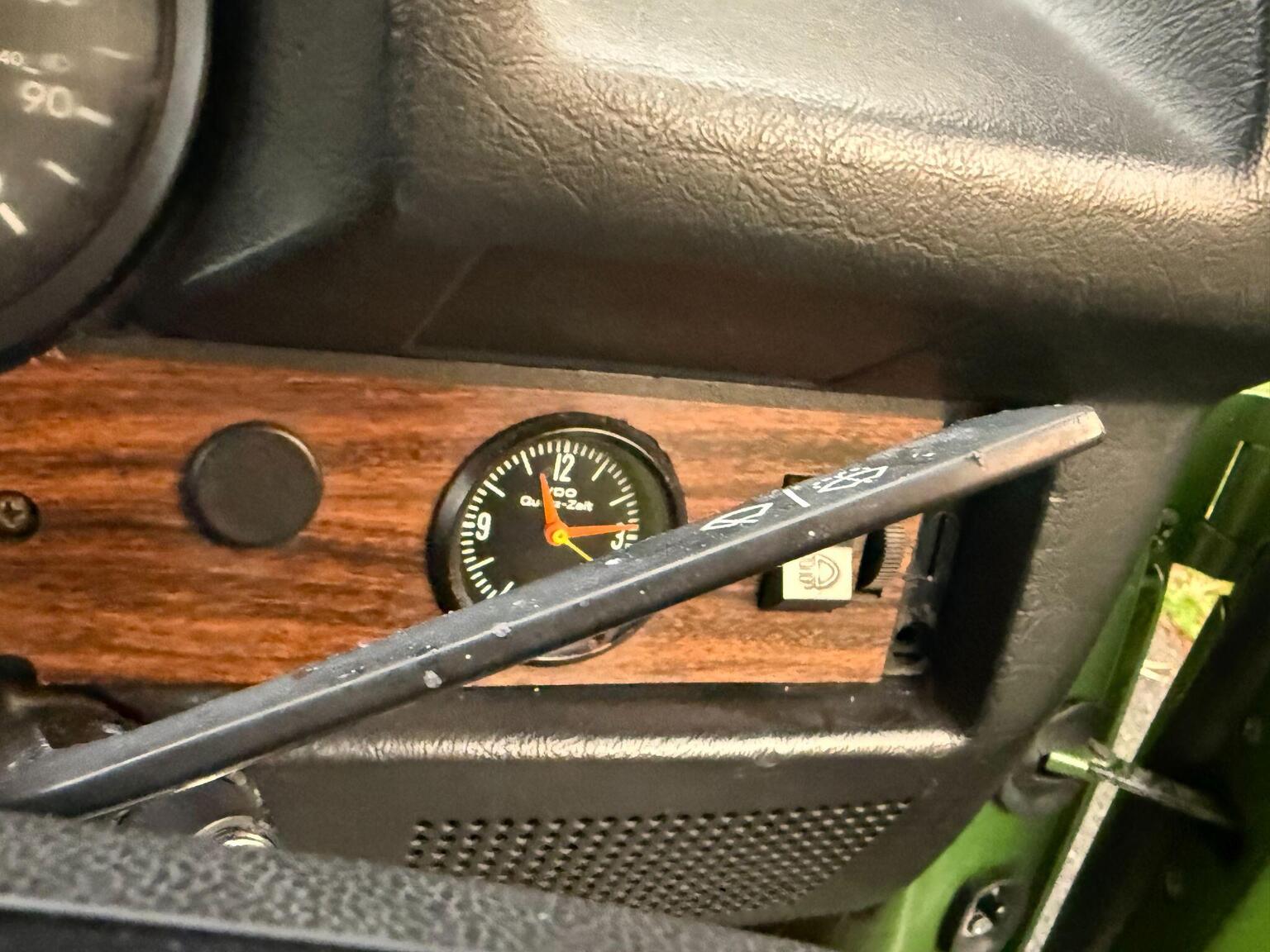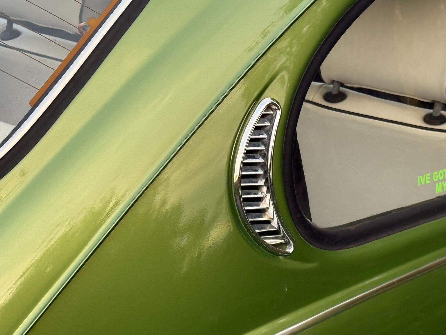 A striking colour that shifts from olive to gold-green under light, paired with tan cord upholstery, wood-effect dashboard trim, and chrome bumpers with rubber inserts, this Beetle represents the most refined version of Volkswagen’s iconic shape.